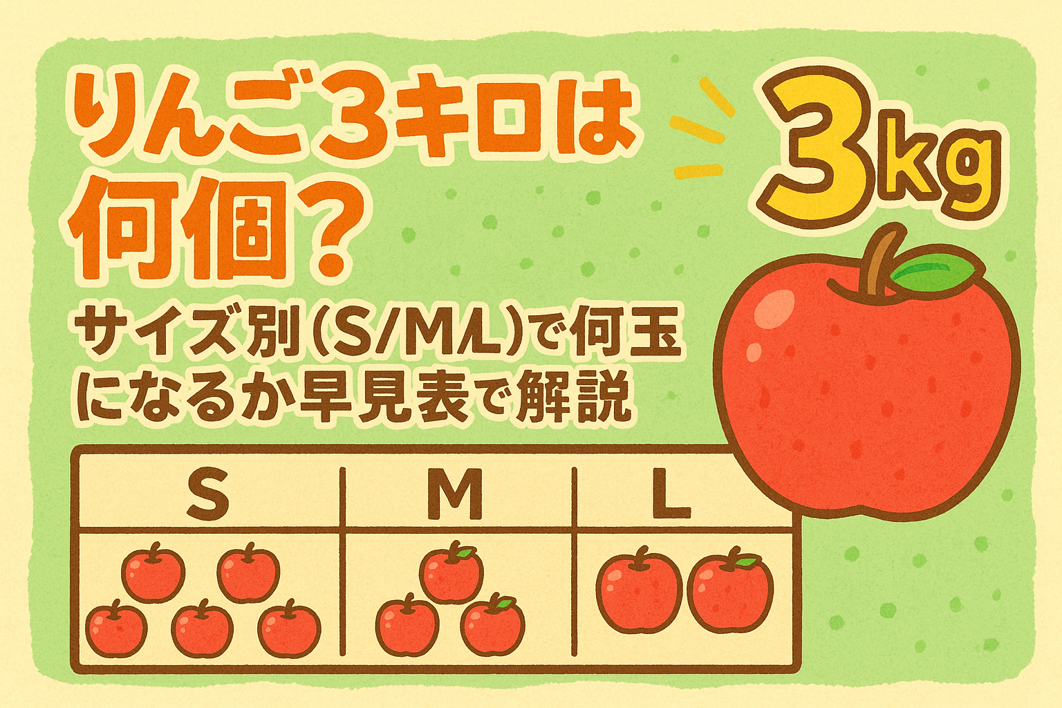 「りんご3kg」=おおむね S:12〜14個/M:10〜11個/L:9個/LL:8個が目安です。これは産地直送のサイズ表(外周・重さ・玉数)にもとづく参考値で、品種・等級(家庭用/贈答用)・詰め方によって前後します。まずは下の早見表で「自分の欲しいサイズ感」を把握し、そのうえで購入ページの玉数表記(例:9〜12玉)を確認すると失敗しにくくなります。