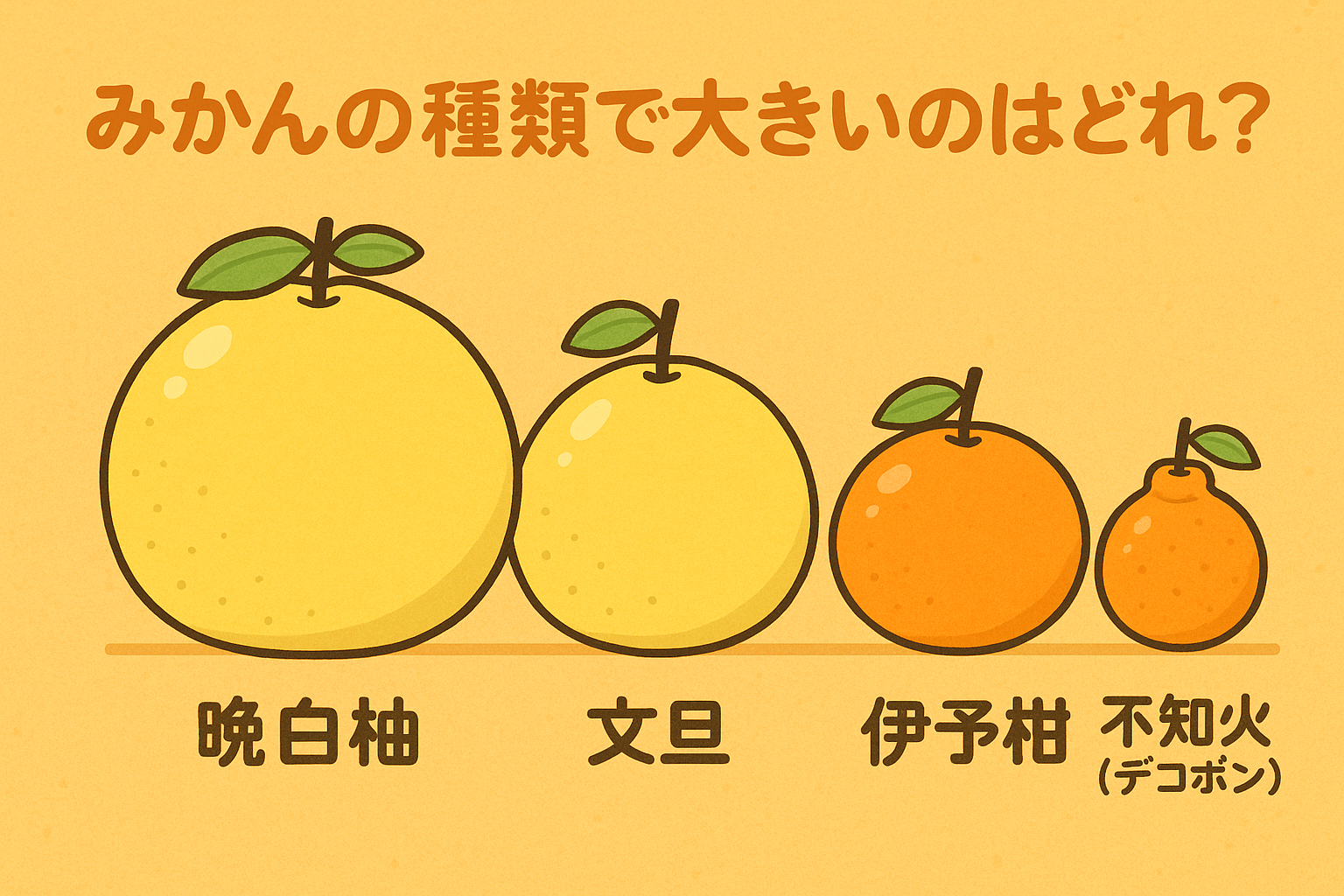 根拠の要点:晩白柚は横径20cm前後・平均約1.8kgの紹介が多く、4kg超〜5kg超の記録例もあります。文旦は2L=10.5〜11.5cm・約470gの例が示され、伊予柑は220〜280g、不知火(デコポン)は200〜280gの案内が一般的です。