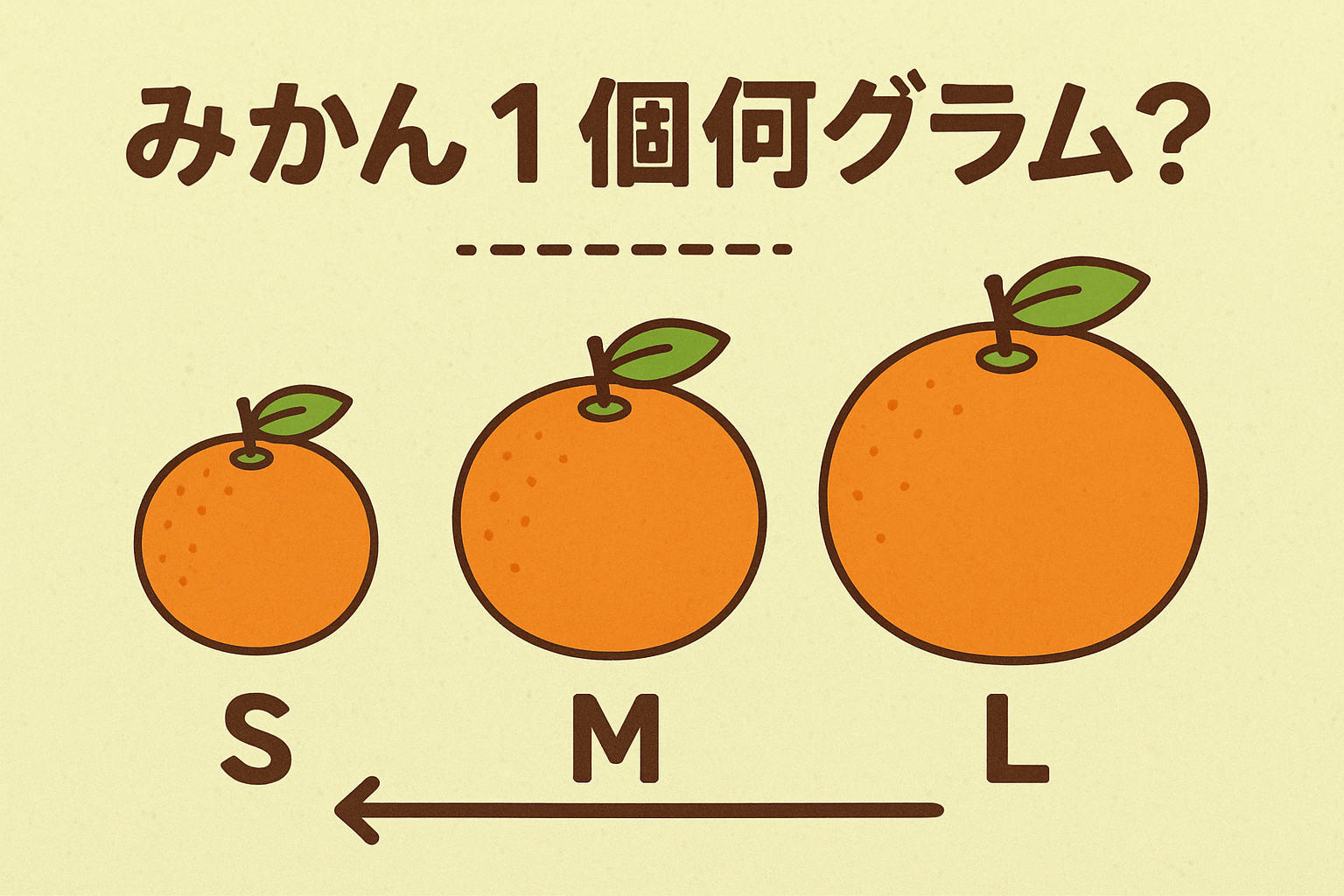 温州みかん(一般的な「みかん」)は1個およそ80〜180gが目安で、サイズ規格はSS(2S)〜2Lまであります。サイズは見た目ではなく直径(横のいちばん太い部分)で決まり、代表的にはS=約55〜61mm/M=約61〜67mm/L=約67〜73mm/2L=約73〜80mmです。この記事では「サイズ別の重さ」「直径の測り方」「可食部とカロリーの計算」「1kg・5kg・10kgで何個か」を、だれでもわかる言葉で丁寧に解説します。