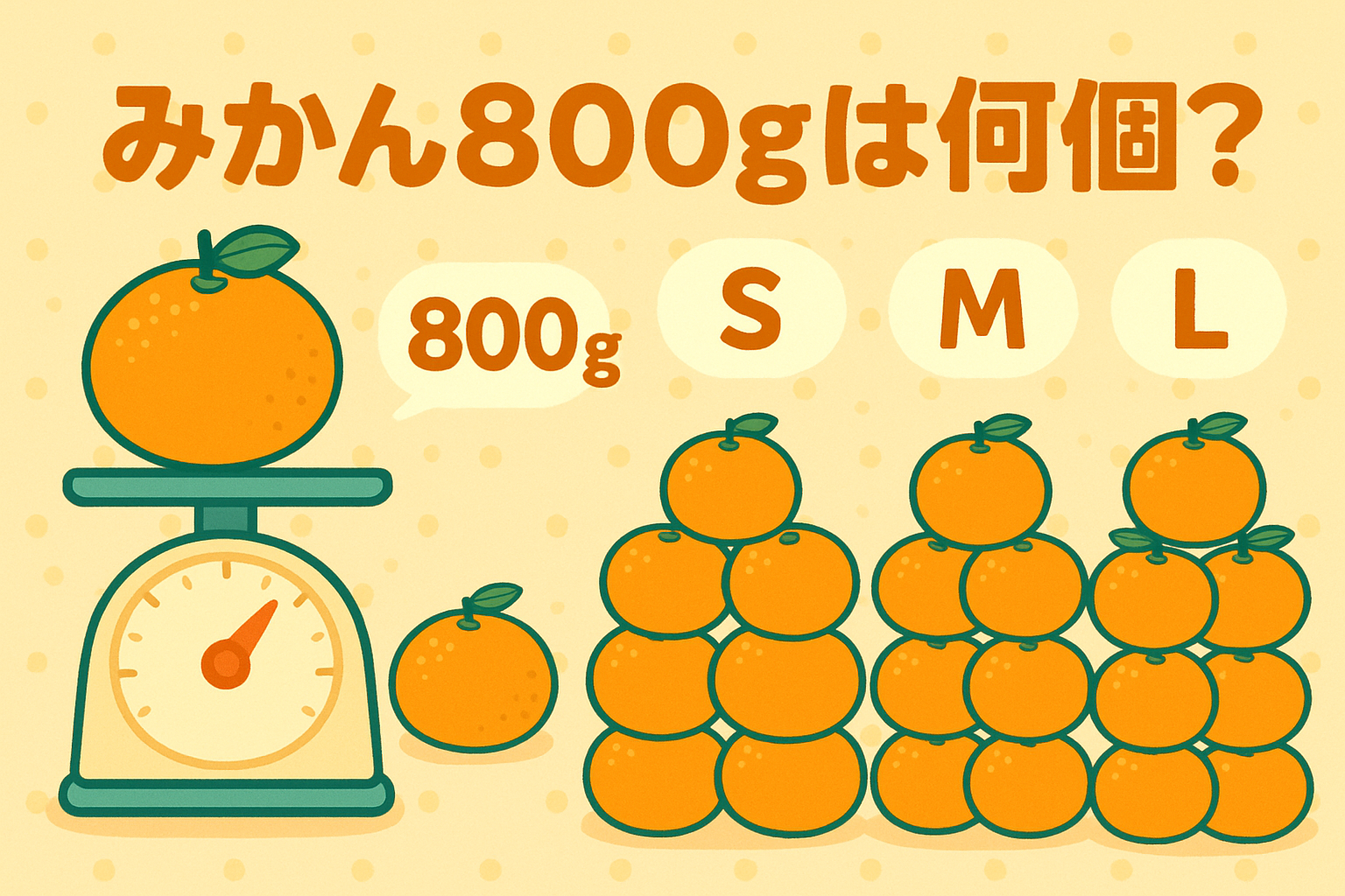 「みかん800gは何個?」はサイズで変わります。Sはおよそ10個、Mは7個前後、Lは6個前後が目安です。サイズは“直径(mm)”で決まるので、重さ=個数には幅があります。まずは早見表でサッと把握し、その後で根拠(サイズ規格・実測・計算式)をやさしく解説します。